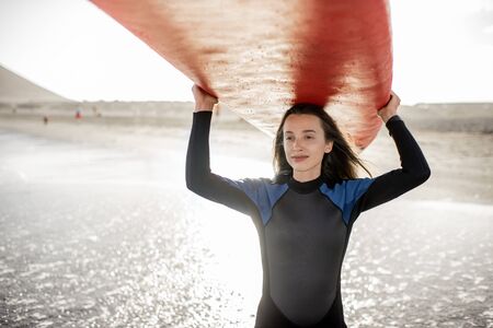 Portrait of a young woman in wetsuit carrying surboard above the head, preparing for surfing on the wild beach on a sunset. Active lifestyle concept