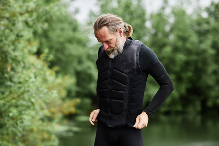 Waist up portrait of bearded active senior man putting on wetsuit and diving gear standing by scenic forest lake copy space