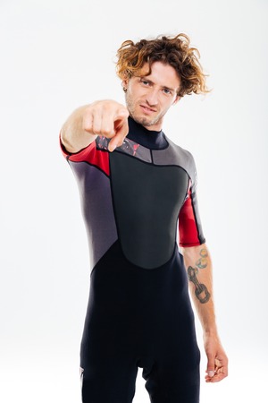 Portrait of a serious concentrated man in diving suit pointing finger at camera over white background