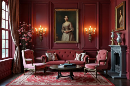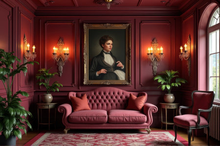 Elegant victorian living room with portrait of caucasian female in lavish red decor. That the image is generated using AI.