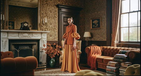Stylish woman in a long orange dress in a vintage interior.