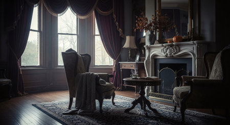 Elegant victorian living room with portrait of caucasian female. That the image is generated using AI.