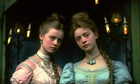 Three beautiful models with elegant hairstyles posing in retro style clothes and expensive luxury jewelry. victorian hairstyle. Ai generative