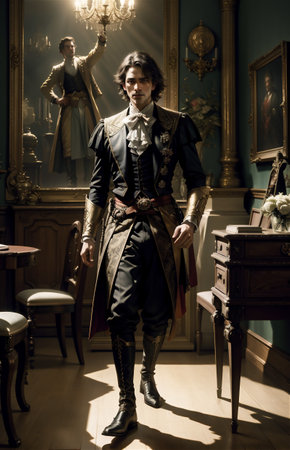 An opulent gold mirror reflects a stunning antique painting, a glittering crystal chandelier, and the elegant details of a luxurious interior. This image showcases a baroque design with ornate gold detailing, perfect for illustrating concepts of luxury, history, and refined taste. The reflection provides a unique perspective on the room's classic decor, ideal for interior design projects, articles on historic architecture, or marketing materials for high-end brands. The image evokes feelings of wealth and vintage charm.