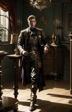 Handsome young man in elegant suit is standing in the interior of an old mansion.