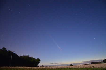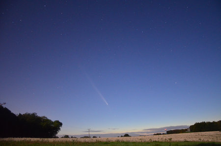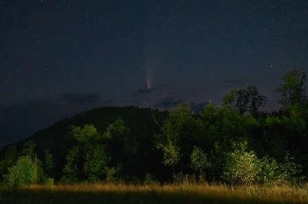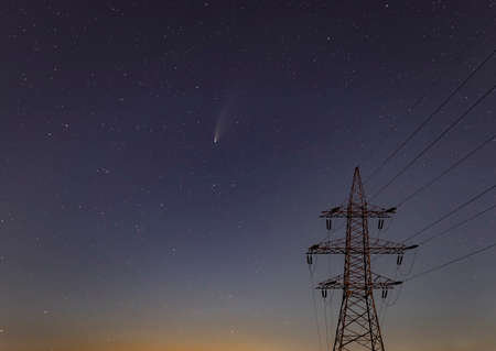 New comet Neowise C / 2020 F3 soars between the stars in the dark night sky. Space objects and a wide panoramic view of the countryside