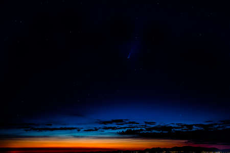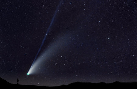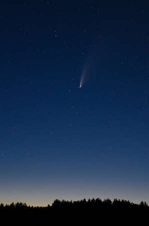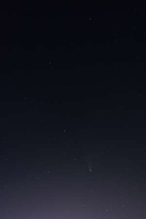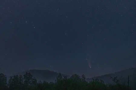 Snapshot of comet Neowise in clear blue starry sky. Beautiful summer night in the mountains. Concept of astrophotography