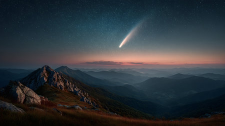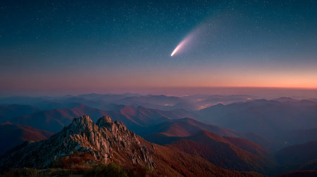 Captivating twilight scenery featuring a comet soaring over majestic mountain peaks, all beneath a vast, star filled sky, creating a breathtaking and enchanting atmosphere of wonder