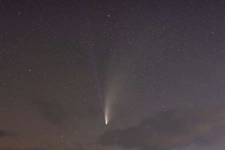 View of the C/2020 F3 (NEOWISE) comet close-up at night among the stars. The brightest C/2020 F3 (NEOWISE) comet in the last few years. Large dusty tail of a C/2020 F3 (NEOWISE) comet close-up