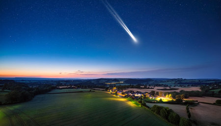 A bright meteor streaks across the dark night sky filled with stars, illuminating a peaceful landscape with trees and open fields.