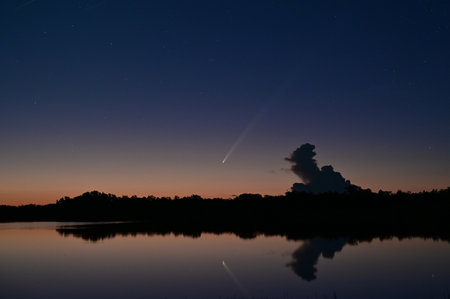 Comet Tsuchinshan-ATLAS rises in east over calm water of Nine Mile Pond in Everglades National Park, Florida in early twilight.
