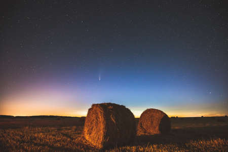 Comet Neowise C2020 F3 In Night Starry Sky Above Haystacks In Summer Agricultural Field. Night Stars Above Rural Landscape With Hay Bales After Harvest. Agricultural Concept