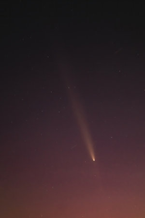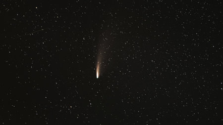 Stunning comet tail leaving a trail of light as it moves across the night sky, with vibrant colors trailing behind.