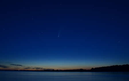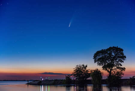 Comet C / 2020 F3 Neowise in night sky over Dnieper river, Ukraine.