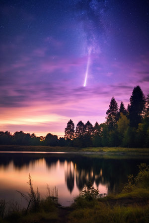 A stunning view of a brilliant meteor streaks across the night sky, illuminating the horizon. This serene landscape captures the beauty of the cosmos and inspires wonder.