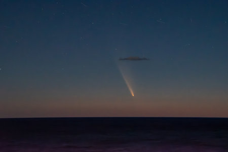 A spectacular comet illuminates the darkening sky, leaving a radiant trail above a tranquil horizon during the evening hours.