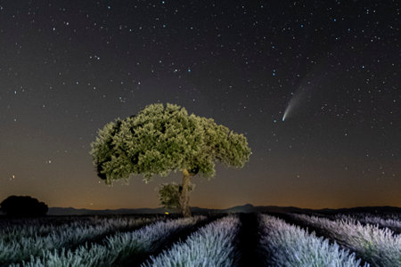 A stunning comet lights up the night sky above lavender fields and a solitary tree in the countryside.