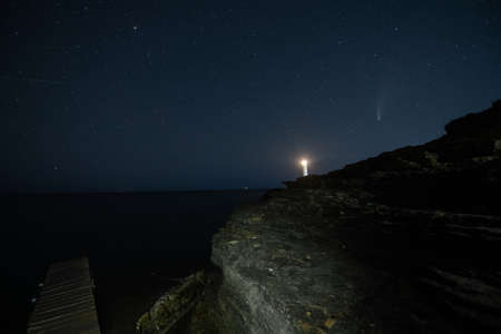 HDR Landscape view of Neowise comet over white Lighthouse at night sky at beach