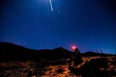 Astronomy lover with a telescope observing a comet in the blue starry sky at night. Silhouette of a person observing the immensity of the universe and the stars. Trace of a comet or a shooting star.