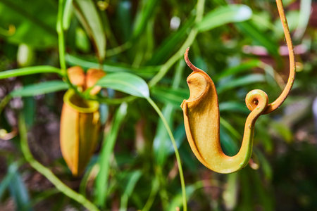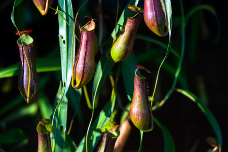 Large Nepenthes carnivorous plants grow among orchids under tropical light in the lush greenery of Singapore Botanic Gardens
