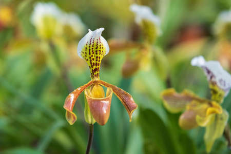 Colorful Paphiopedilum slipper or Lady slipper orchid blooming in the garden.