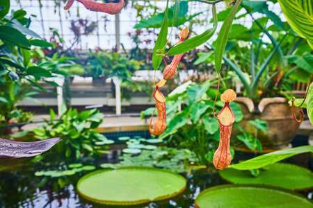tropical pitcher plants or monkey cups in the botanical garden