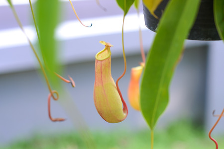 Nepenthes tree, Tropical pitcher plants growth in the garden. Pitcher of nepenthes carnivor plant. Nepenthes tree and fruit in the garden with blur foreground and blur background.