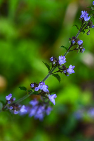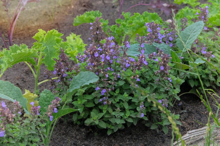 Catmint perennial Australian bugle Ajuga australis Nepeta grandiflora Caucasus catmint Beautiful catmint Giant Catmint Ajuga at cultivation bed plantation selective focus.