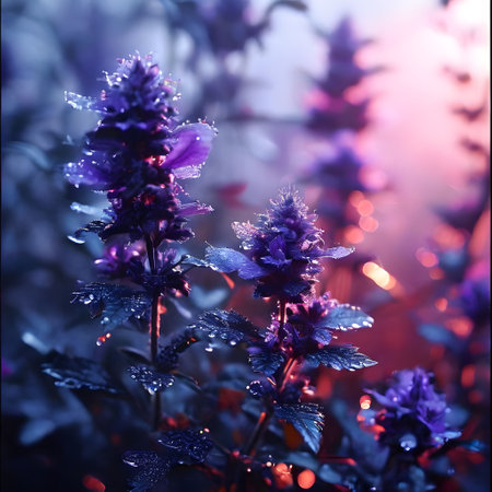 Clusters of delicate purple flowers flourish in a vibrant garden, basking in warm sun rays.