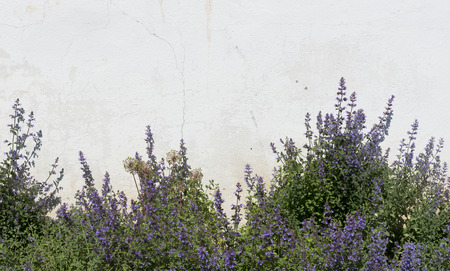 Decorative purple flowers on the background of the old vintage white plastered wall in bright sunny day