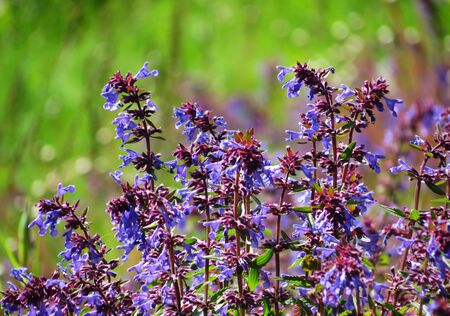 the flowering of melissa. purple flowers on a green background. medicinal treatment. close-up. natural light. Melissa. Lamiaceae. Melissa officinalis. Mentheae.