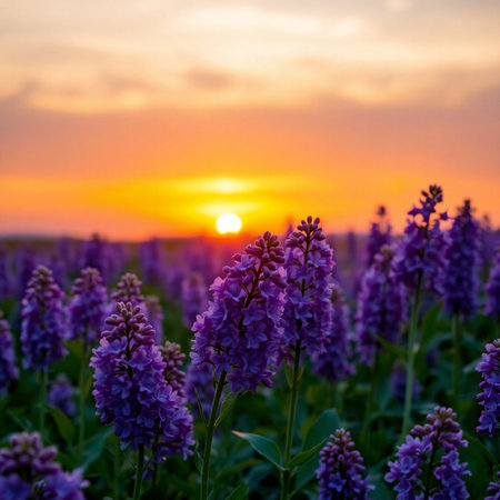 Vibrant purple lavender flowers at sunset