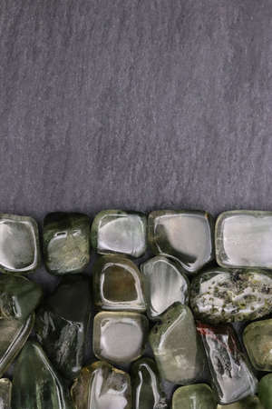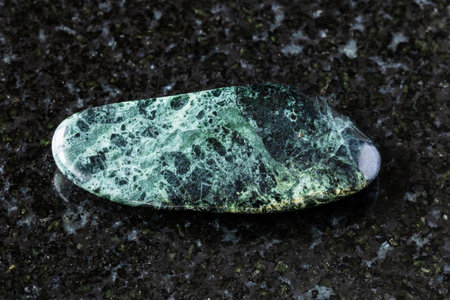 macro shooting of natural mineral rock specimen - tumbled green jadeite stone on dark granite background from Itmurundy massif of Balkhash Region, Kazakhstan