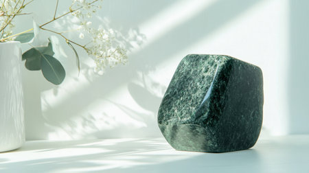 A captivating green stone sculpture rests on a white surface, beautifully illuminated by natural light, accompanied by delicate floral accents, enhancing modern decor.