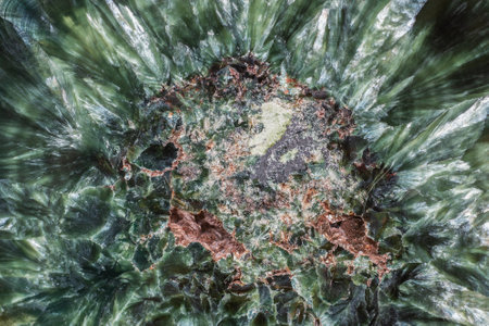 A macro shot showcases the intricate details of a rough piece of Serpentine stone with its unique green hues and brown inclusions
