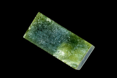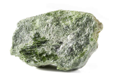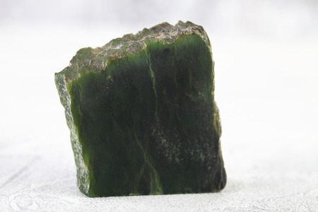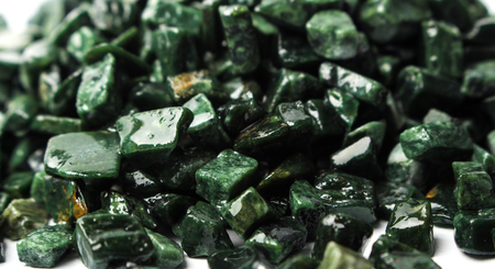 Texture of natural green stone Nephritis on white cement background. Semi precious stones.