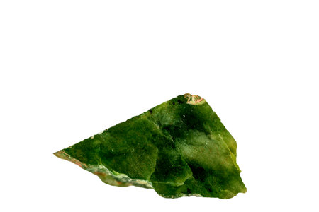 Shiny green muscovite mica mineral sheet on white background. Found in Miass, Ural, Russia. For geology mineralogy magazines websites article, Natural Science museum wall chart.