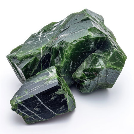 A close-up view reveals rugged layered formations and shimmering mineral veins within a deep green stone, illuminated by gentle, even lighting that enhances its natu