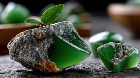A green rock with a leaf on top sits on a table. The rock is surrounded by other green rocks, and there are bowls and a wooden bowl nearby. Concept of natural beauty and tranquility