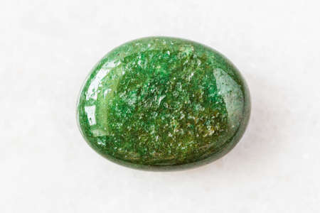closeup of sample of natural mineral from geological collection - polished green Aventurine gem stone on white marble background from India