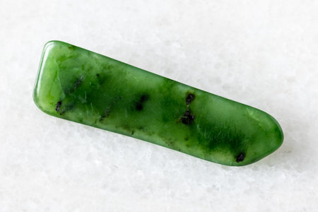 A smooth green stone resting on a white surface, reflecting light beautifully while showcasing its natural textures. Perfect for wellness, relaxation, or artistic projects.