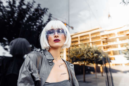 Stylish blonde in futuristic clothes and glasses on a mirror background.