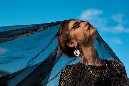 Urban Style. Young stylish woman standing outdoors under veil posing closed eyes joyful