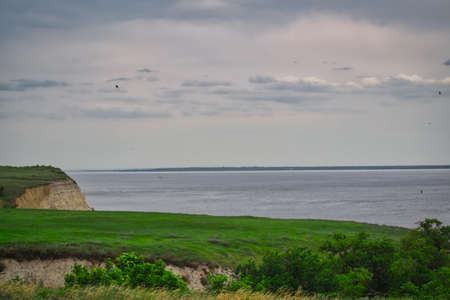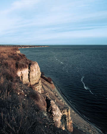 Beautiful sunset view on the sea coast from the top of the hill. Black Sea. Anapa, Krasnodar region.