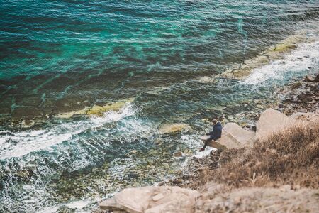 Beautiful view from the cliff on the blue sea. Incredible coast with freestanding cliffs in the sea. Cape Fiolent, Crimea.