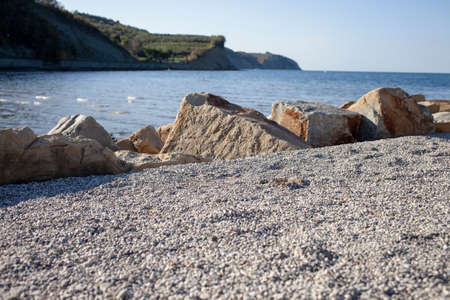View on a beach with sand, round stones and beautiful blue sea water in the background