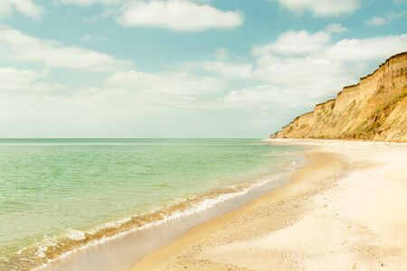Crimea, Russia. The picturesque landscape of the Black Sea coast, known as Eltigen. Sandy seashore and rocky cliffs in the evening sunlight.