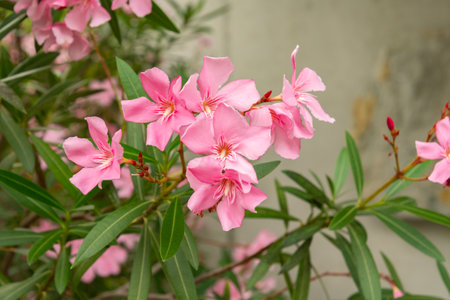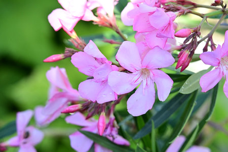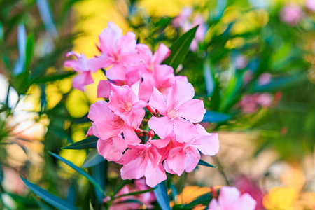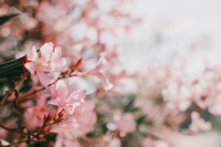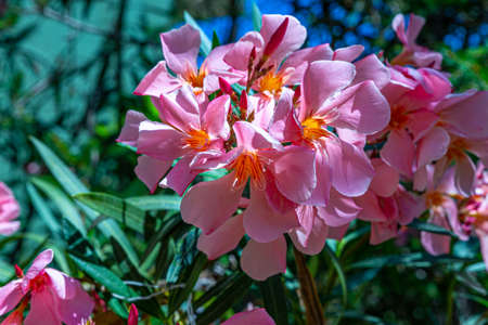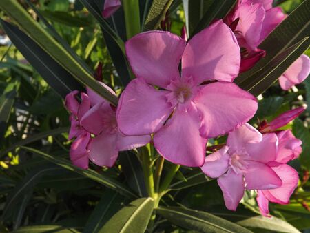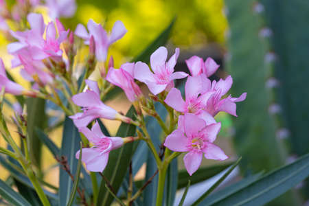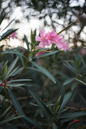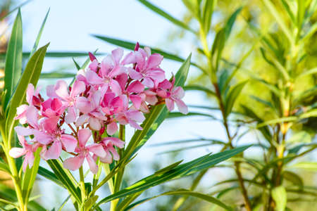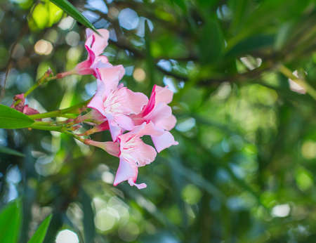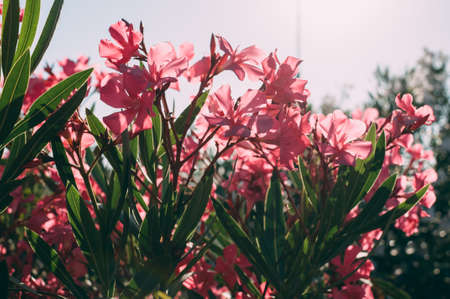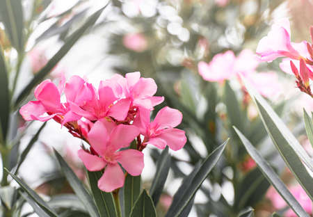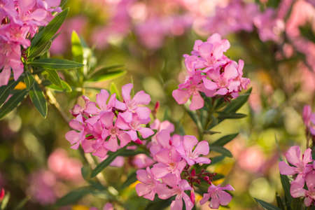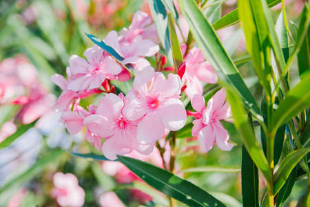 Delicate flowers of pink oleander, Nerium oleander, bloomed in summer. Shrub, small tree, garden plant. natural beautiful background.