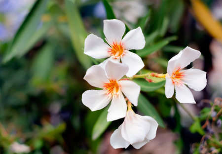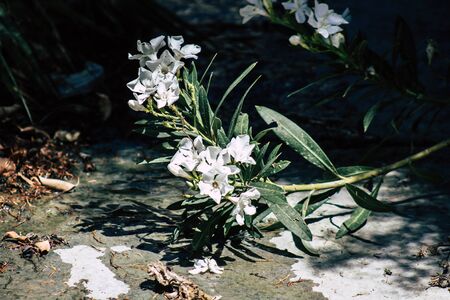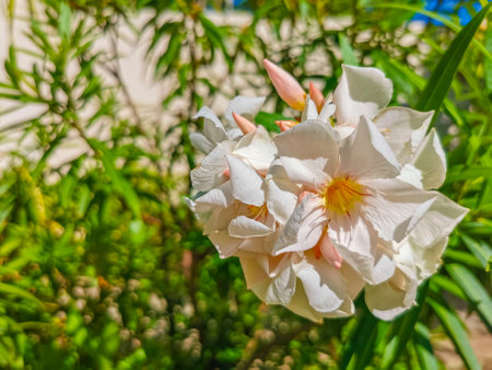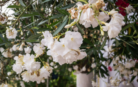 White flowers blooming oleander plants. White Nerium. Delicate white oleander flowers, in summer on the Greek streets.