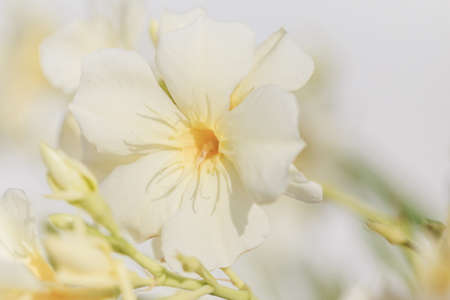 Blooming white nerium oleander. Selective focus. Two flowers close-up.